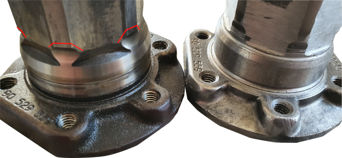 Poniżej zdjęcie uszkodzonej piasty z zaznaczonymi na czerwono wyżłobieniami (po lewej) oraz sprawnej piasty (po prawej)